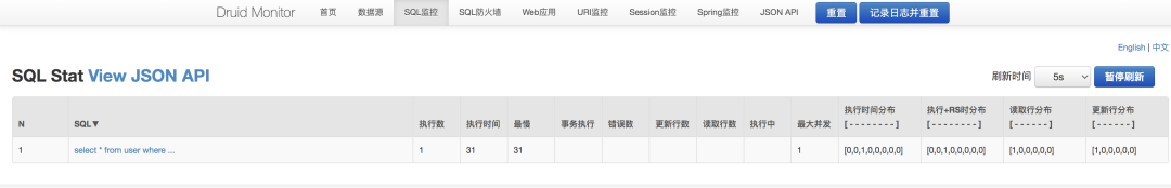 接下来我们访问 http://localhost:8080/user?username=aaa 地址,执行一条 SQL,执行完成后,我们来查看 SQL 监控: