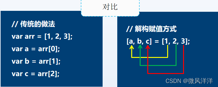 除了前面学习过的变量声明与赋值方式,ES6中还提供了另外一种方式——解构赋值。例如,若把数组[1,2,3]中的元素分别赋值为a、b和c,传统的做法是单独为变量声明和赋值。