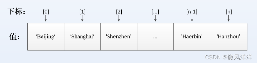 下标:又称索引,以数字表示,默认从0开始依次递增,用于识别元素。