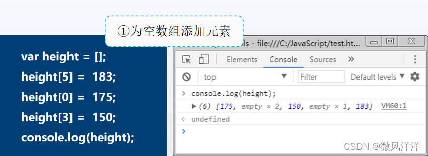 - 允许下标不按照数字顺序连续添加,未设置具体值的元素,会以空存储位置的形式存在。