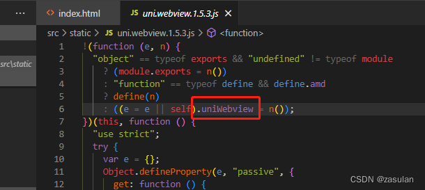 此处需要将uni.webview.1.5.3.js下载到本地,然后修改里面的内容,因为默认自带的方法名为uni,会和本地的uni命名冲突(官方案例是放在html原生页面里所以不影响,我放在vue项目里则会冲突),所以我改成了uniWebview,可以格式化后修改,位置如下,微信的SDK本地的和在线的都可以用