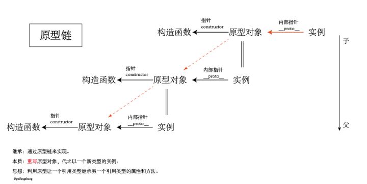 每个构造函数都有一个原型对象,原型对象都包含一个指向构造函数想指针(constructor),而实例对象都包含一个指向原型对象的内部指针(__proto__)。如果让原型对象等于另一个类型的实例,此时的原型对象将包含一个指向另一个原型的指针(__proto__),另一个原型也包含着一个指向另一个构造函数的指针(constructor)。假如另一个原型又是另一个类型的实例……这就构成了实例与原型的链条。