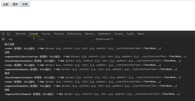 运行程序,依次单击“挂载”,绑定onClick={this.handler}“单击”按钮,“更新”和“卸载”按钮结果如下: