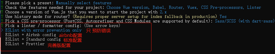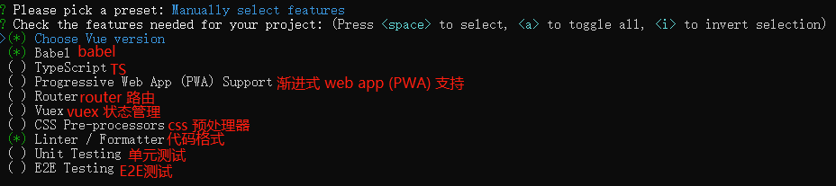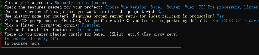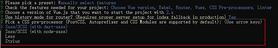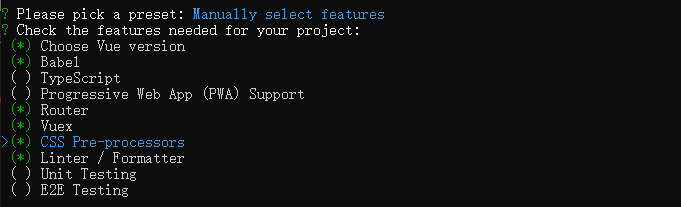第三项可以手动选择创建项目时 一同创建的"工具",比如vue-router,sass 等等,