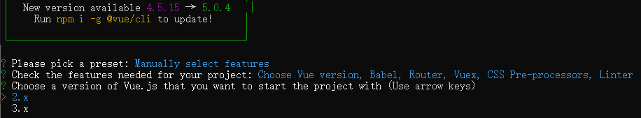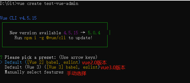 和你 确认创建vue项目的版本(选项分别 为vue2.0 以及 vue3.0)