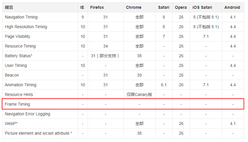 Frame Timing API 虽好,但是,现在Frame Timing API的兼容性不算很友好,额,不友好到什么程度呢。还没有任何浏览器支持,处于实验性阶段,属于面向未来编程。这你 TM 逗我呢?说了这么久完全不能用.....