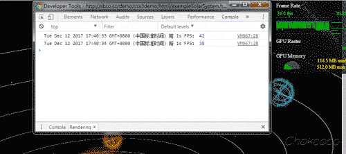 这里,我使用了我之前制作的一个页面进行了测试,使用 Chrome 同时调出页面的 FPS meter,对比两边的实时 FPS 值,基本吻合。