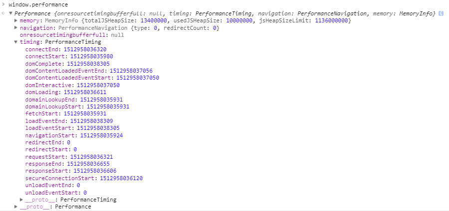 在调试台 console 中打印window.performance,查看其中的 timing 属性:
