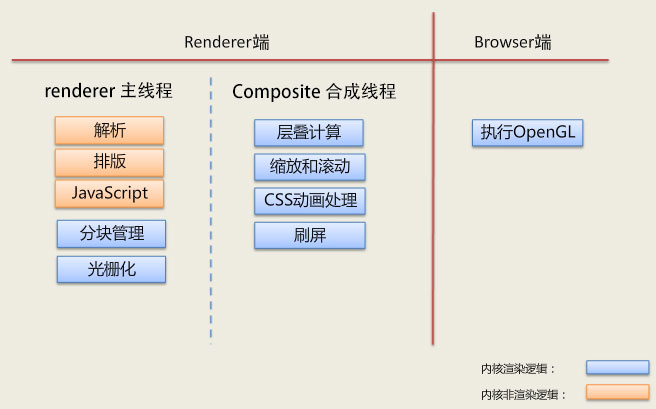 以 Chrome 浏览器内核 Blink 渲染页面为例。对早期的 Chrome 浏览器而言,每个页面 Tab 对应一个独立的 renderer 进程,Renderer 进程中包含了主线程和合成线程。早期 Chrome 内核架构: