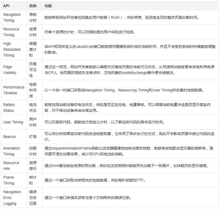 Web Performance Timing API是 W3C 推出的一套性能API 标准,用于帮助开发者对网站各方面的性能进行精确的分析与控制,提升 Web 网站性能。