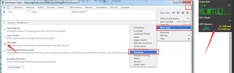Chrome 提供给开发者的功能十分强大,在开发者工具中,我们进行如下选择调出FPS meter选项: