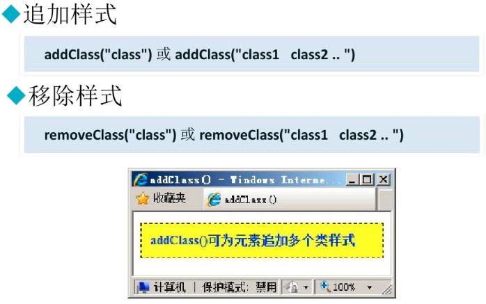 使用jQuery可以同时追加或移除一个、多个样式,语法如下: