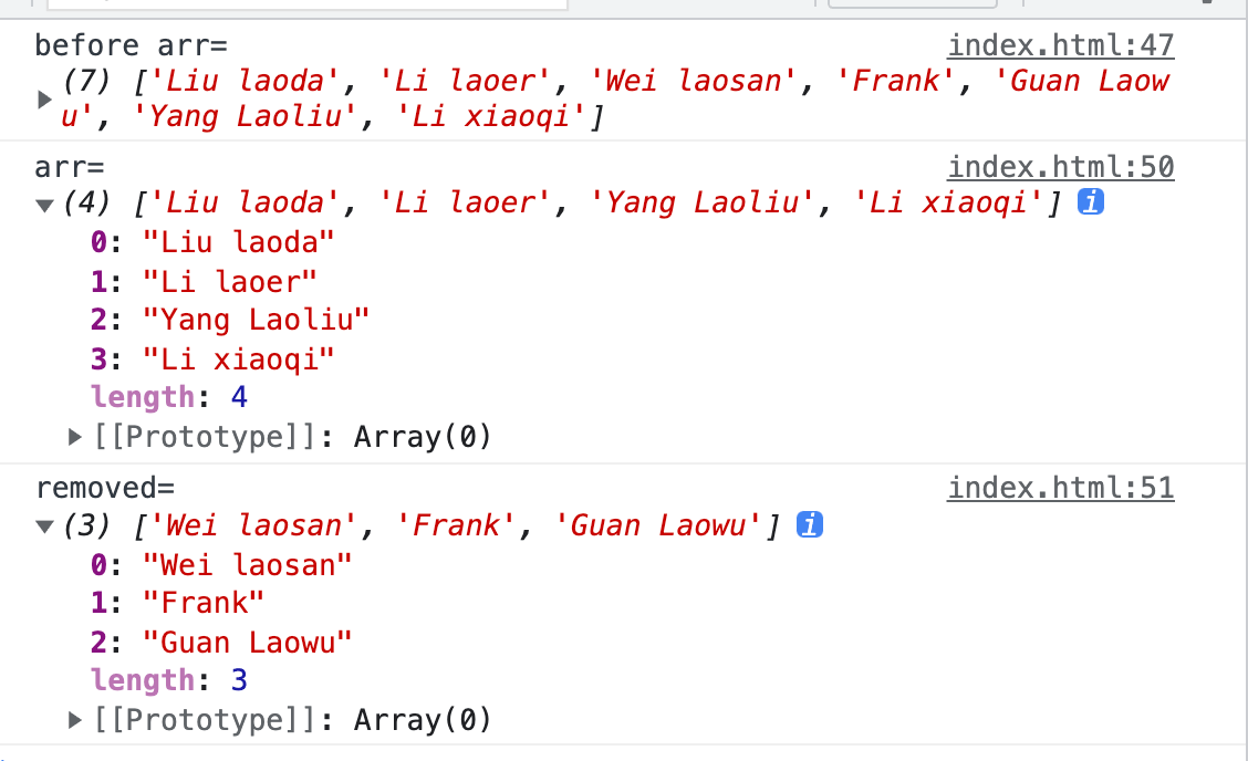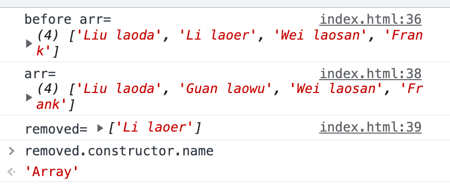 console.log('removed=', removed);// ['Wei laosan', 'Frank', 'Guan Laowu']注意这里删除元素 直接对原来的数组修改, 返回值 就是删除的元素的数组。