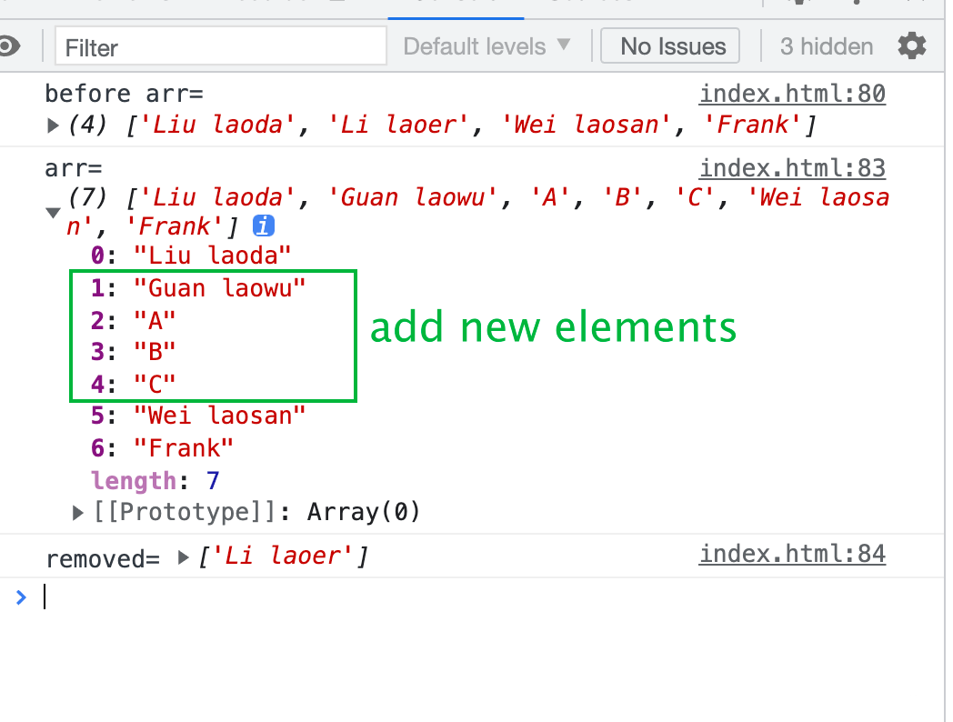 console.log('removed=', removed);// ['Wei laosan', 'Frank', 'Guan Laowu', 'Yang Laoliu', 'Li xiaoqi']添加元素
