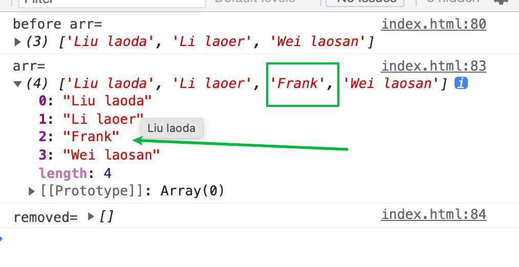 console.log('removed=',removed); // []在数组尾部添加元素, Frank