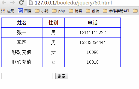 代码比较简单,首先给button按钮添加单击事件,然后获取文本框中的内容,再从表格中tr进行查找,首先把表头的tr过滤掉,然后把其他的tr全部隐藏掉,然后按照内容进行过滤,把过滤出来的行显示出来。