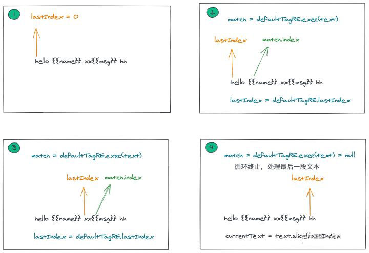// match.index === lastIndex时,说明此时是{{}}中的内容,前边没有字符串