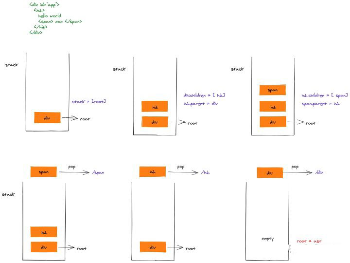 while循环html字符串,每次删除掉已经匹配的字符串,直到html为空字符串时,说明整个文本匹配完成 - 通过栈数据结构来记录所有正在处理的标签,并且根据标签的入栈出栈顺序生成树结构