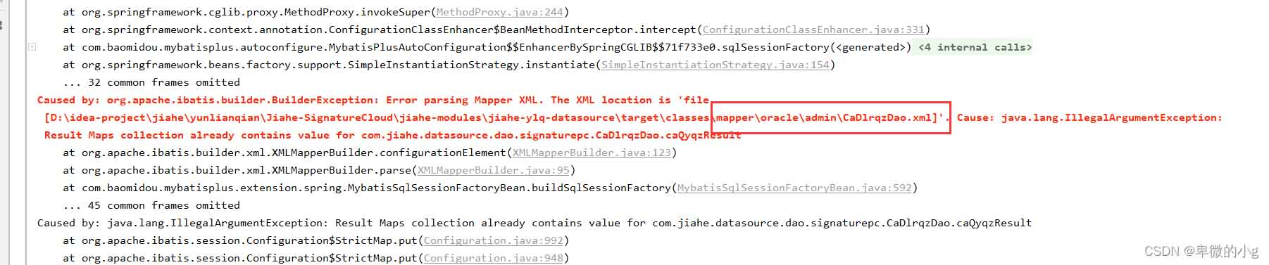 Caused by: org.springframework.beans.factory.BeanCreationException: Error creating bean with name 'sqlSessionFactory' defined in class path resource [com/baomidou/mybatisplus/autoconfigure/MybatisPlusAutoConfiguration.class]: Bean instantiation via factory method failed; nested exception is org.springframework.beans.BeanInstantiationException: Failed to instantiate [org.apache.ibatis.session.SqlSessionFactory]: Factory method 'sqlSessionFactory' threw exception; nested exception is org.springframework.core.NestedIOException: Failed to parse mapping resource: 'file [D:\idea-project\jiahe\yunlianqian\Jiahe-SignatureCloud\jiahe-modules\jiahe-ylq-datasource\target\classes\mapper\oracle\admin\CaDlrqzDao.xml]'; nested exception is org.apache.ibatis.builder.BuilderException: Error parsing Mapper XML. The XML location is 'file [D:\idea-project\jiahe\yunlianqian\Jiahe-SignatureCloud\jiahe-modules\jiahe-ylq-datasource\target\classes\mapper\oracle\admin\CaDlrqzDao.xml]'. Cause: java.lang.IllegalArgumentException: Result Maps collection already contains value for com.jiahe.datasource.dao.signaturepc.CaDlrqzDao.caQyqzResult