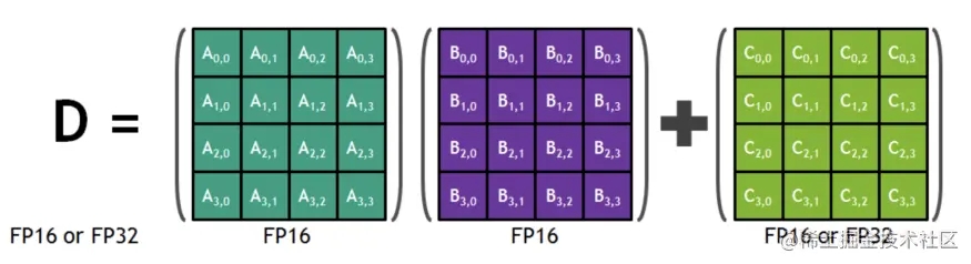 我们可以将两个FP16矩阵相乘,并将其添加到一个FP16/FP32矩阵中,从而得到一个FP16/FP32矩阵。Tensor cores支持混合精度数学,即以半精度(FP16)进行输入,以全精度(FP32)进行输出。上述类型的操作对许多深度学习任务具有内在价值,而Tensor cores为这种操作提供了专门的硬件。