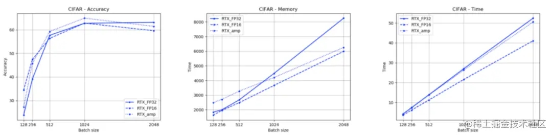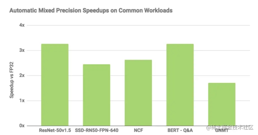 根据NVIDIA给出的基准测试,AMP比标准的FP32快3倍左右,如下图所示。