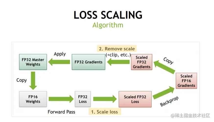 - 使用损失缩放 为了保留小的梯度值。梯度值可能落在FP16的范围之外。在这种情况下,梯度值被缩放,使它们落在FP16范围内。