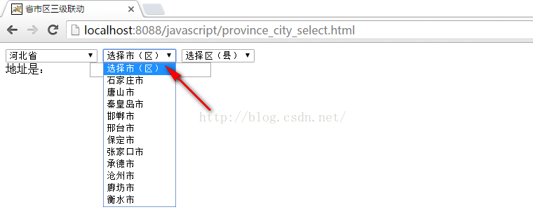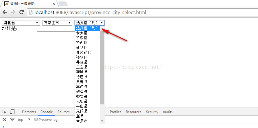 下拉选择省的,然后出现市的,选择了市的,然后出现了区的,最后选择区的时候,得到地址: