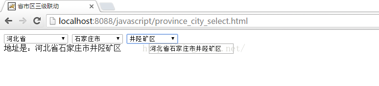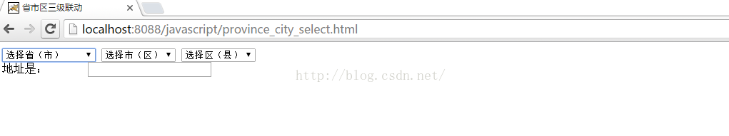 <!DOCTYPE html> <html> <head> <meta charset="UTF-8"> <title>省市区三级联动</title> <script type="text/javascript" src="jquery-1.8.3.min.js"></script> <script type="text/javascript" src="province_city.js"></script> </head> <body> <select id="province" name="province"> </select> <select id="city" name="city"> </select> <select id="area" name="area"> </select> <div> 地址是:<span id="pro_city"></span> <input id="txtProCity" type="text" /> </div> </body> </html>