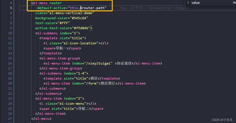 1,在el-menu加上router,添加el-menu的default-active属性,加:动态绑定,值设置为"this.$router.path" ,