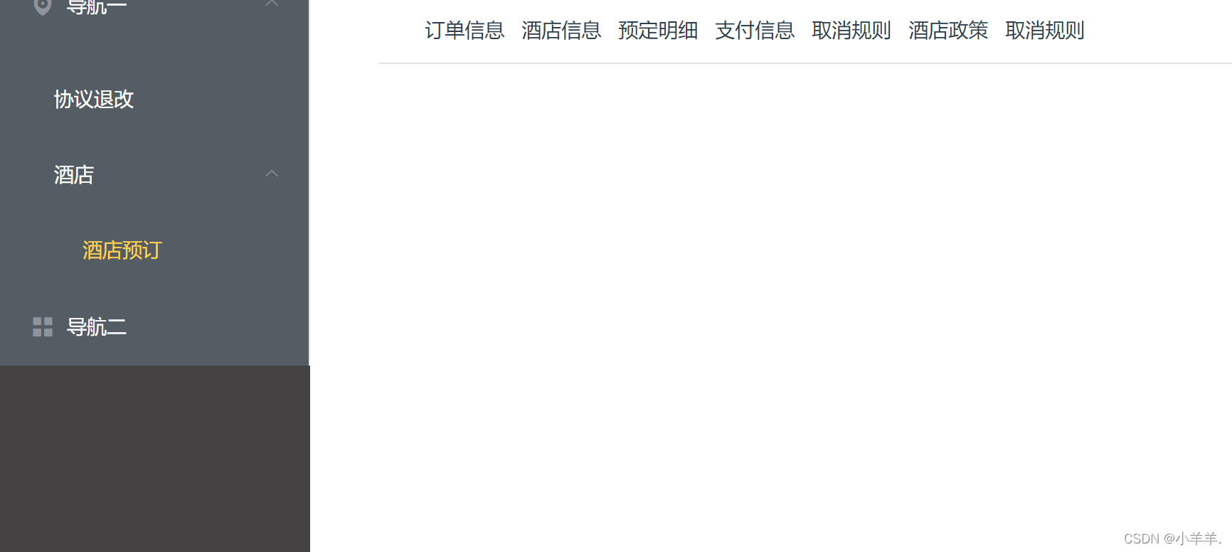 <el-menu router :default-active="this.$router.path" class="el-menu-vertical-demo" background-color="#545c64" text-color="#fff" active-text-color="#ffd04b"> <el-submenu index="1"> <template slot="title"> <i class="el-icon-location"></i> <span>导航一</span> </template> <el-menu-item-group> <el-menu-item index="/xieyituigai" >协议退改</el-menu-item> </el-menu-item-group> <el-submenu index="1-4"> <template slot="title">酒店</template> <el-menu-item index="/form">酒店预订</el-menu-item> </el-submenu> </el-submenu> <el-menu-item index="2"> <i class="el-icon-menu"></i> <span slot="title">导航二</span> </el-menu-item> </el-menu>