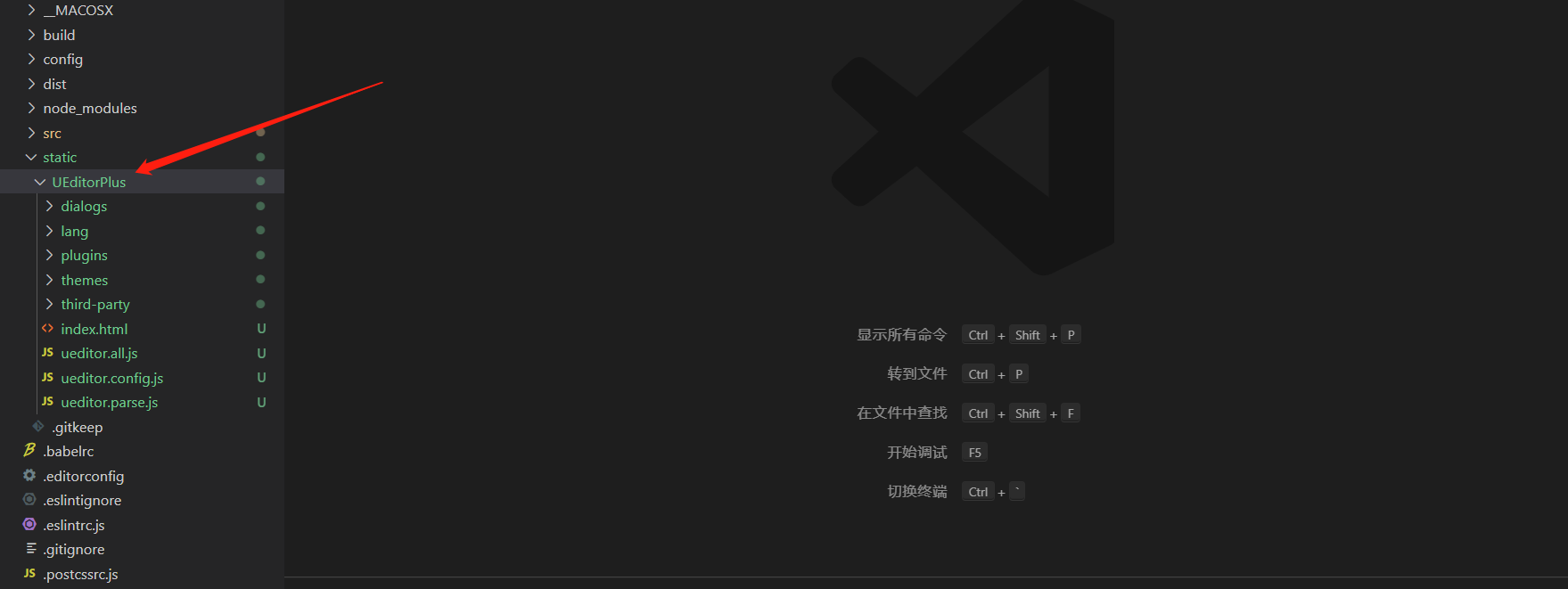 第二步:解压后找到dist文件夹,复制并粘贴到vue项目包中的static(vue3粘贴到public)文件夹目录下,并改名为UEditor