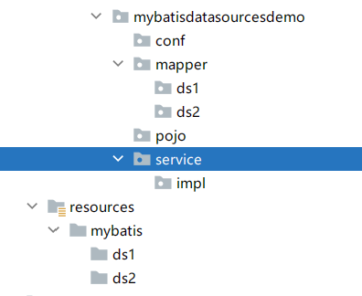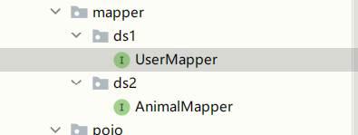ds1 路径下 与 ds2 路径下各一个 mapper文件 分别由 ds1配置类 与 ds2配置类 去扫描生成代理类