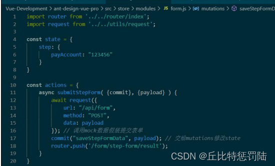 结合vuex和vue-router,建一个store文件夹在其下面建modules文件夹,下面再建一个form.js,导入router、request,定义一个state对象,下包含step对象里面只有payAccount即可。定义一个actions对象,下面一个异步的submitStepForm接收{commit}和{payload},调用request请求,url是‘/api/form’,方式是post,数据是payload,返回请求后我们commit一个mutation,命名为saveStepFormData,把payload传过去,然后路由跳转到‘formep-form/result’结果页。