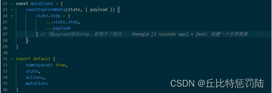 定义一个mutations对象,saveStepFormData接收state和{payload},我们要在里面改变state里面的step值(拓展运算符摊开step和payload,因为理论上是有很多的数据)。最后是暴露出这三个对象(同时开启命名空间!)在store下面再建一个文件index.js,导入刚才的form.js,在实例化中加一个modules对象,里面丢个form,如此就完成了store,不过需要注意的是外面还有一个store.js(无用可以删),而之前的mian.js默认是找到这个store.js(原本是找到刚才新建的index,被外面这个拦住了),可能会报错,重启工程或者指明更清楚的路径就行。