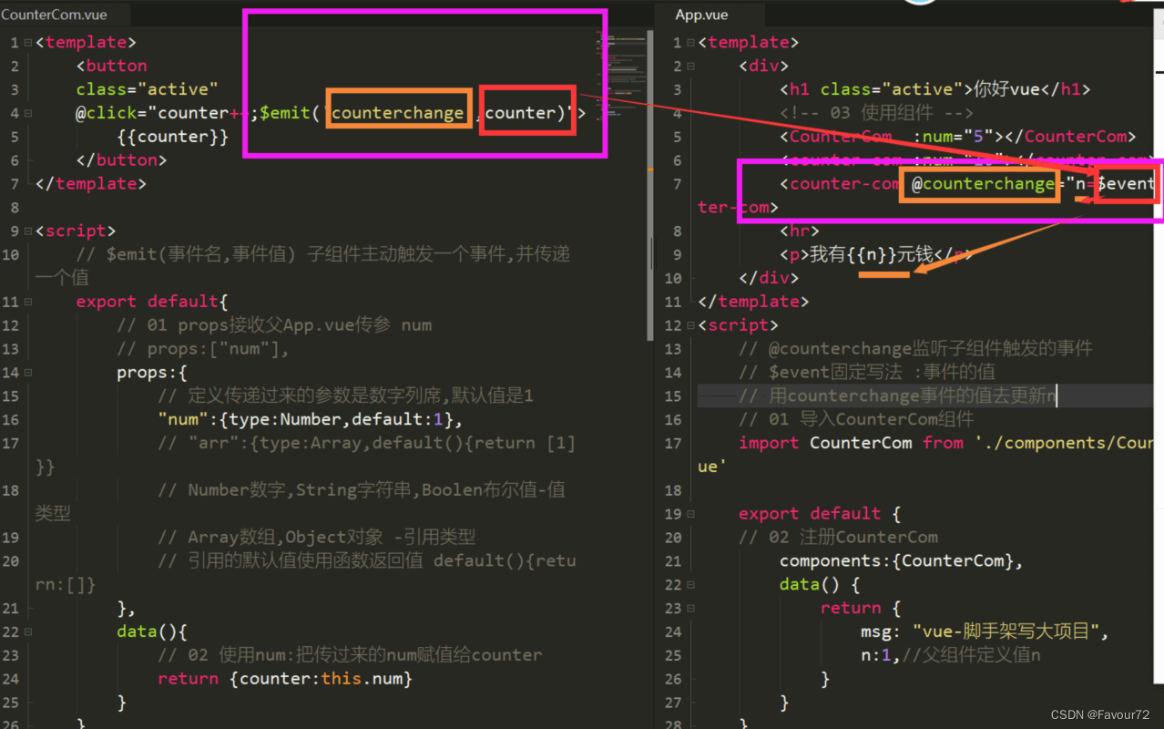 $emit(事件名,事件值) 子组件主动触发一个事件,并传递一个位置,事件名(counterchange)和事件值(counter)是自定义的