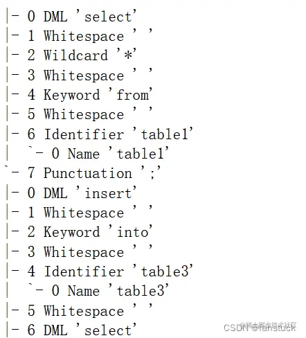 得到的SQL无论是ANTRL还是SQLPARSE都是解析为一棵树的形式进行递归回溯。最终都要解析生产的SQL树: