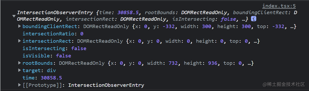 上面提到的changes数组中的每一项都是一个IntersectionObserverEntry 对象(下文简称io对象),对象提供目标元素的信息,一共有八个属性,我们打印这个对象: