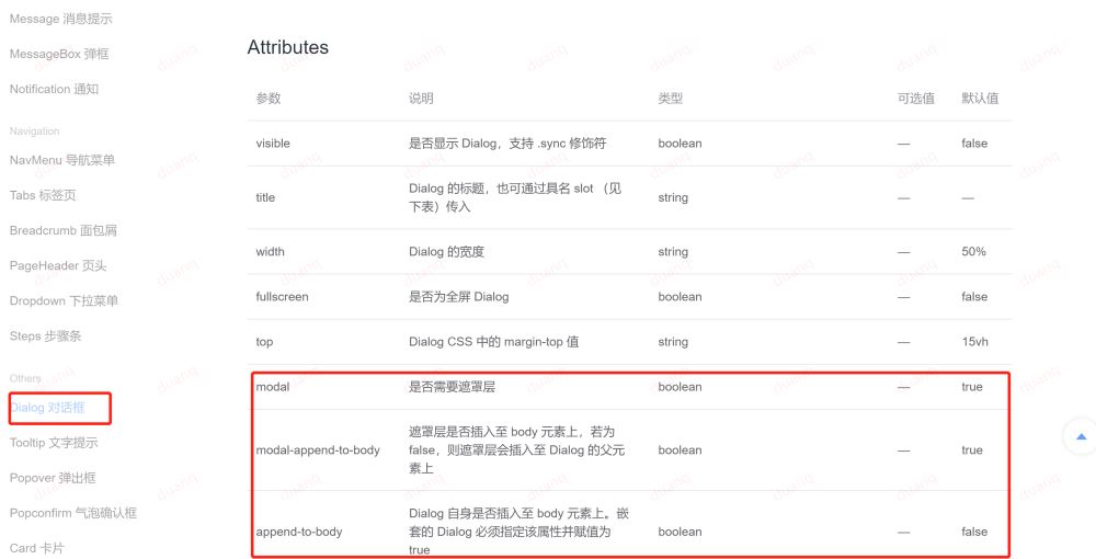 查看组件中不同属性的作用,我使用的蓝色弹框是使用的element组件中的dialog组件,故此,通过查找该组件中的属性,发现以下三个属性跟遮挡层有关