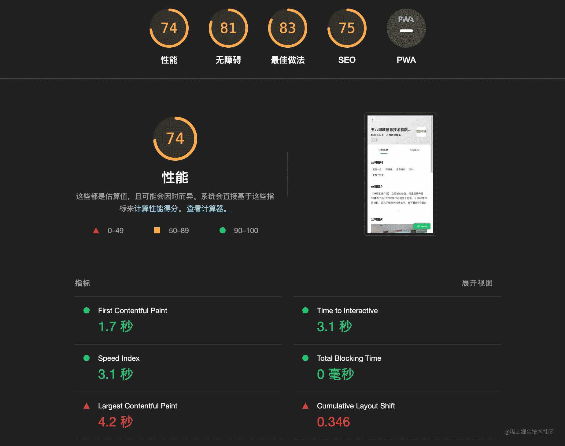 注意: 需要值得大家注意的是,我们当前所有测试全部建立在,移动端(之所以用移动端,是由于pc 的强大算力,很少有性能瓶颈)的基础上,并且页面上必须有一下内容,才能得出分数,内容必须包括一下的一种或者多种