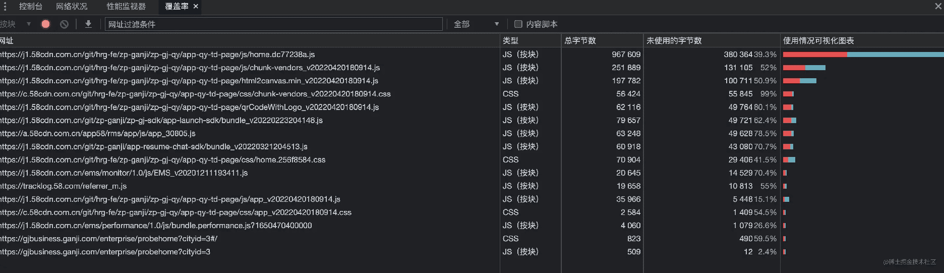 利用 devtool的代码覆盖率检查就能知道那些js 或者css 文件的代码没有被使用过,结合包内容的分析,我们就能大概的猜出性能的瓶颈在哪里从而做相应的特殊处理