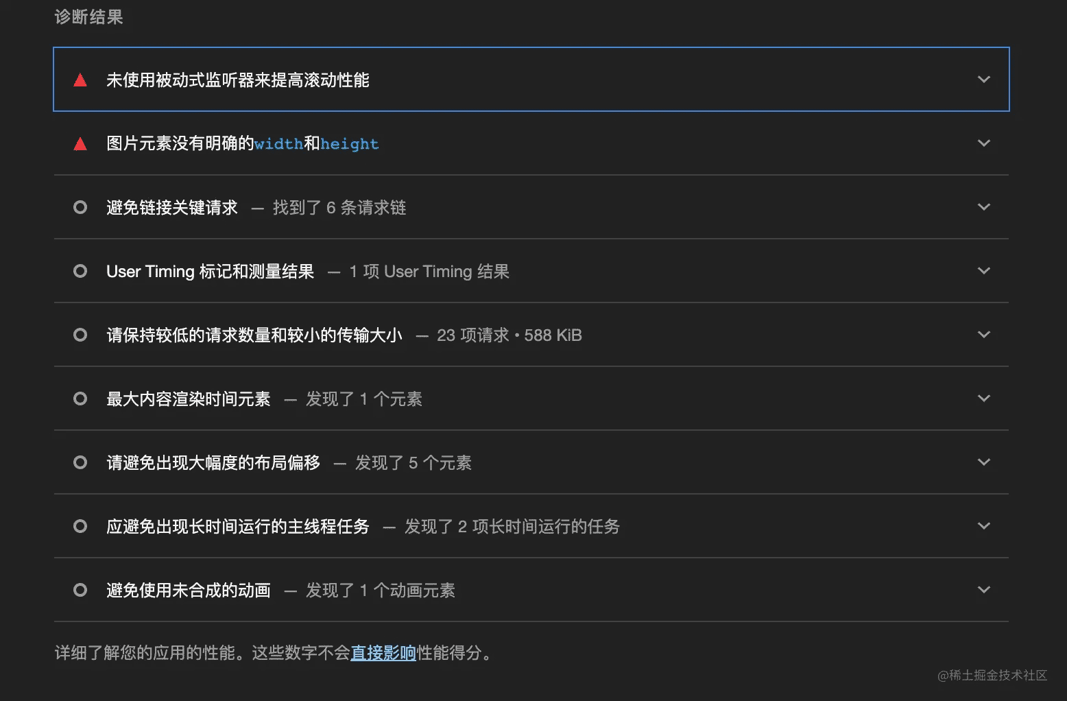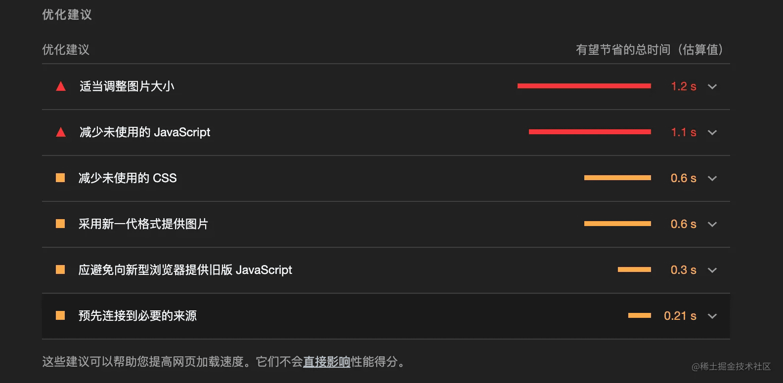 lighthouse的的牛x之处就是它能找出你页面中的一些常规的性能瓶颈,并提出优化建议,比如: