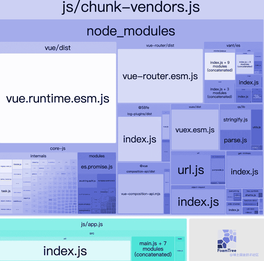 如上图所示 在打包后就能分析出打包后的js 文件他包含什么组件,如此以来,我们就能知道那些文件是没必要同步加载的,或者走cdn的,通过配置将他单独的隔离开来,从而找出性能的问题