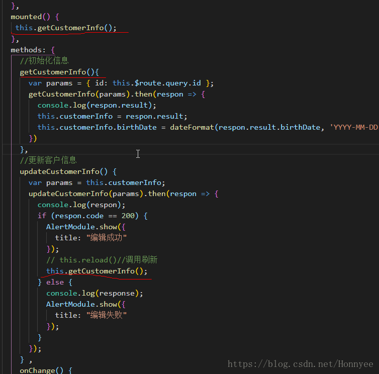 这样,页面开始会初始化信息,修改信息后会执行getCustomerInfo()方法刷新数据,这样更简洁有效的实现了刷新功能。