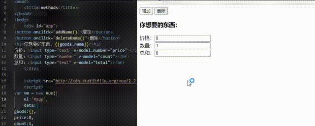 每次按下“增加”按钮的时候,就会显示{{goods.name}}里面的“漫画书”,当按下“删除”的时候{{goods.name}}就会显示为空;当价格和数量改变的时候,总的价格也会跟着改变。