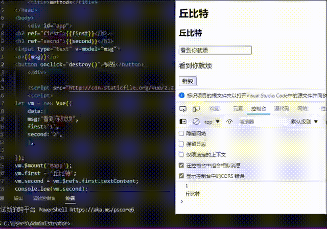 </html>运行结果:我们可以看到,console控制台里面的是‘丘比特’,执行vm.$nextTick的值是msg里面的值--‘看到你就烦’,页面也会同步更新。当你点击‘销毁’的时候,在文本框再写入数值、文本等等,是已经销毁不会在更新了。