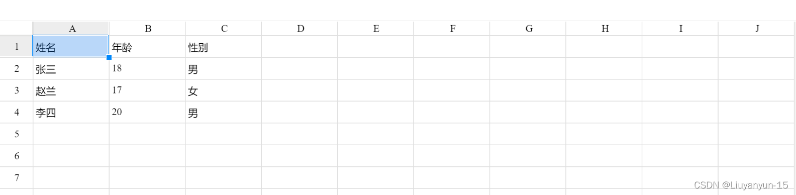 {"excelHeader":["姓名","年龄","性别"],"excelData":[{"姓名":"张三","年龄":18,"性别":"男"},{"姓名":"赵兰","年龄":17,"性别":"女"},{"姓名":"李四","年龄":20,"性别":"男"}]}