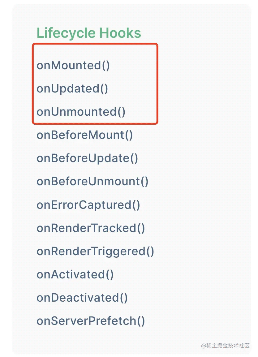 反观借鉴了Hooks的Vue Composition API,则同时提供了watchEffect API与不同场景的生命周期函数。