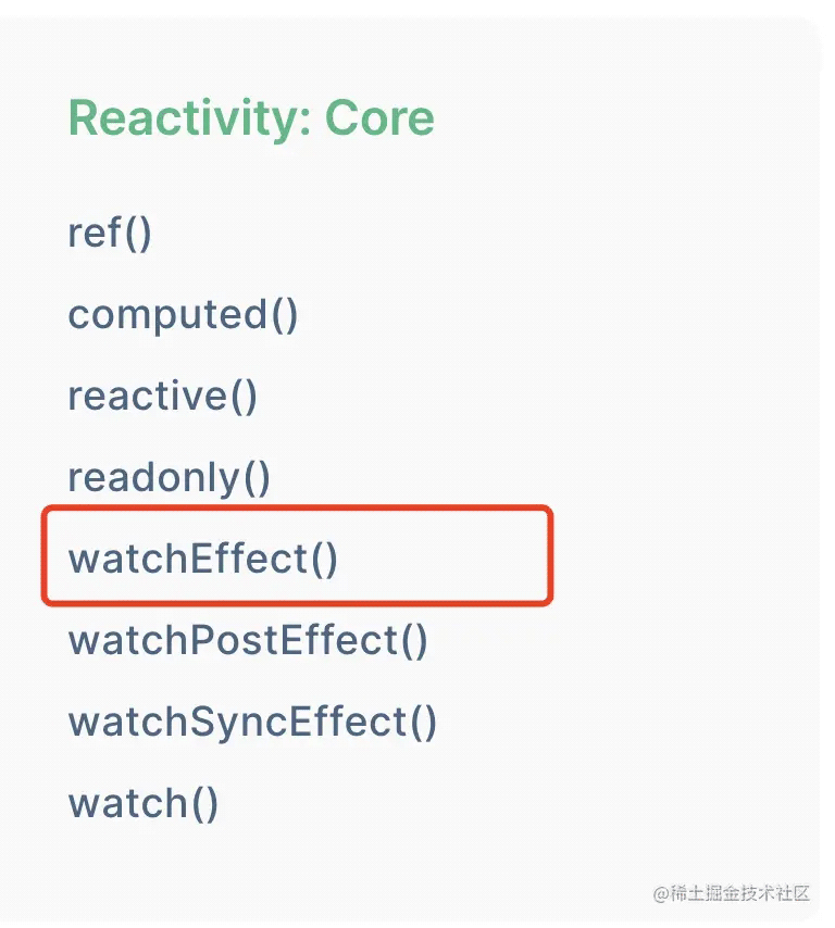比如,在Vue Composition API中,对标React useEffect API的是watchEffect,在Vue文档中,有一小段内容介绍他的用法: