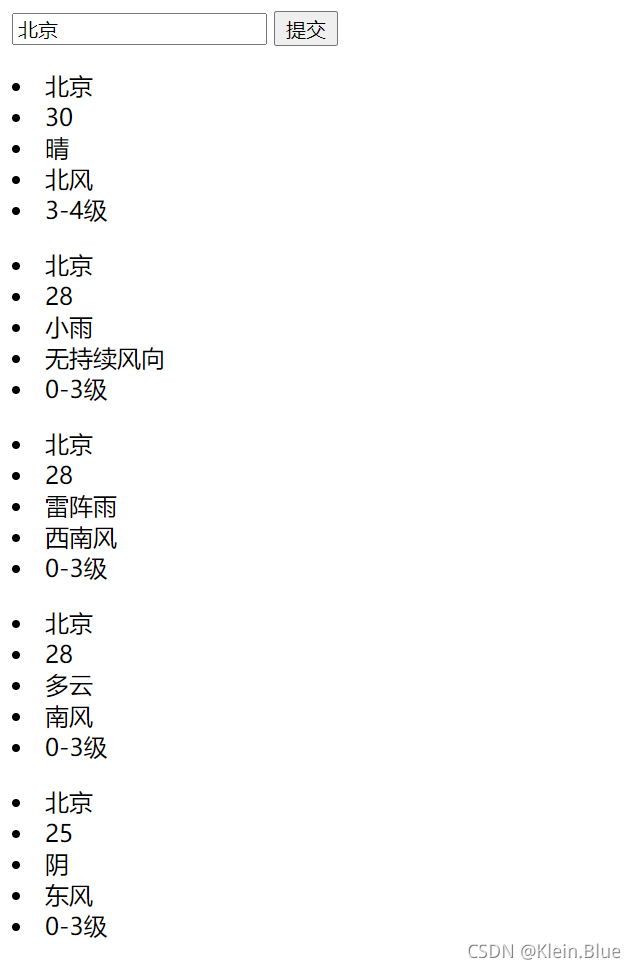 输出要求:每个天气要求:城市名,温度,天气,风向,风力