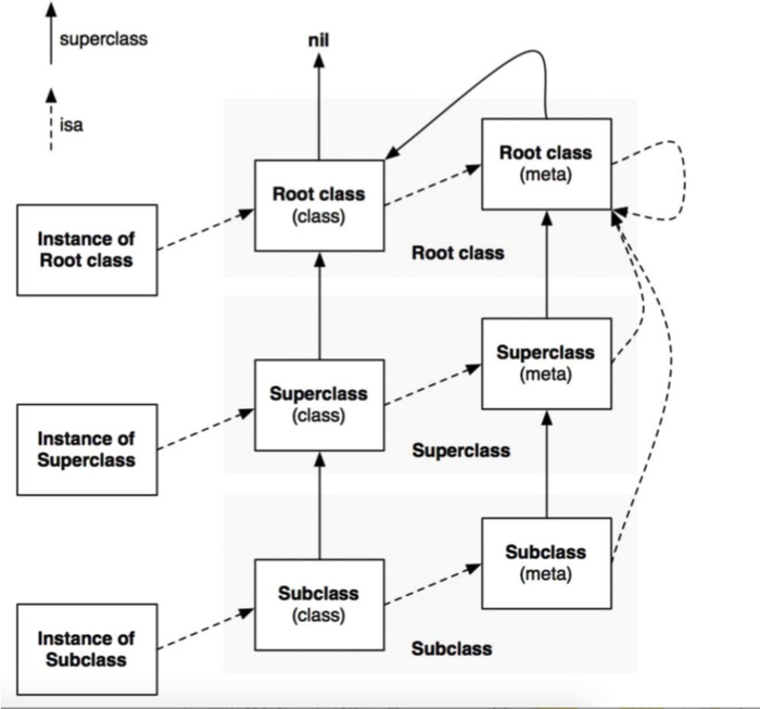 This object is 0x100408400. Class is Person, and super is NSObject. MetaClass is 0x100001328 Following the isa pointer 1 times gives 0x100001350 Following the isa pointer 2 times gives 0x100001328 Following the isa pointer 3 times gives 0x7fffb9a4f0f0 Following the isa pointer 4 times gives 0x7fffb9a4f0f0 NSObject's class is 0x7fffb9a4f140 NSObject's meta class is 0x7fffb9a4f0f0